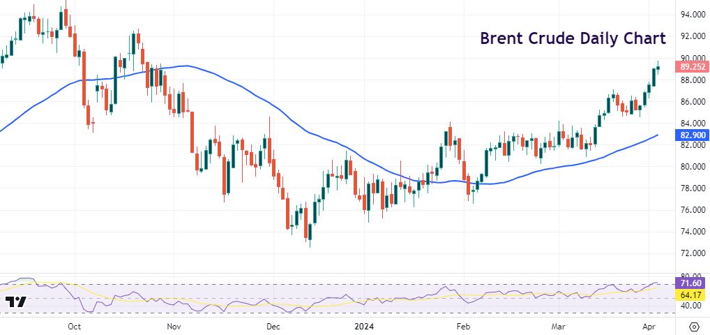 Oil prices continued higher yesterday with Brent hitting an intra-day high of almost US$90. Those levels were last seen back in early November. An escalation in tensions in the Middle East have pushed prices higher. This renewed tension comes at a time when oil fundamentals continue to tighten thanks to the rollover of OPEC+ voluntary additional supply cuts. US and China data also point to robust demand which points to potential inflationary pressures.
