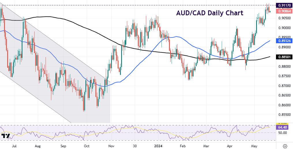 Prices in the cross have now hit resistance and levels last seen in June 2023 just above 0.91. Support comes in just above 0.90 where we had previous consolidation. But if we hold above 0.9076, we could just be tracking sideways before a bust through 0.9117 to new cycle highs with an initial target at 0.9228/31.