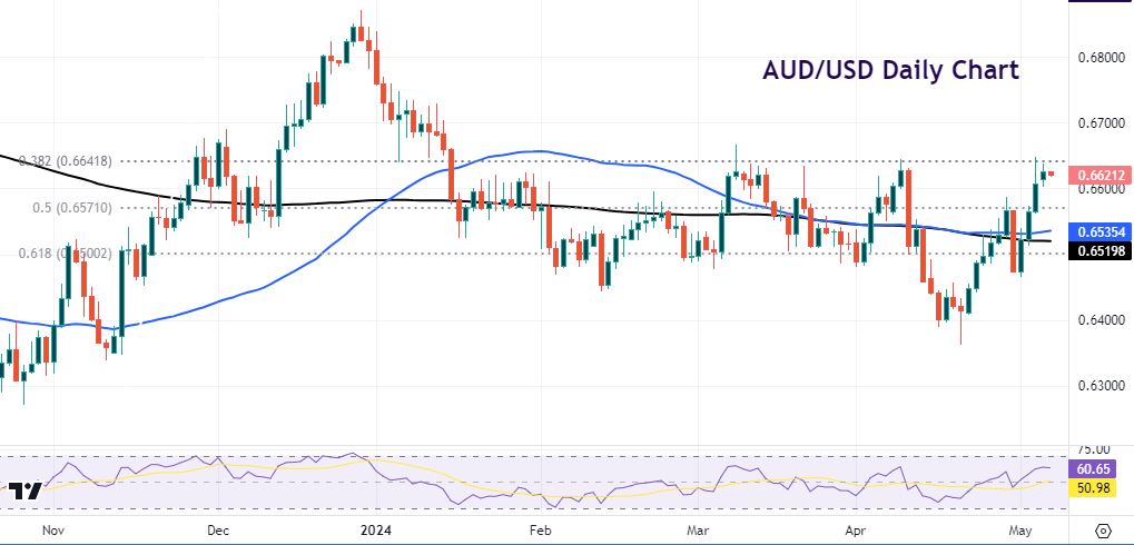 AUD/USD has risen since spiking lower in the middle of last month to 0.6362. Prices then traded around the 50-day and 200-day SMAs. These are currently at 0.6535 and 0.6519 respectively. We have now seen four straight days of buying. But the major has bumped up into resistance at a Fib level (38.2%) of the Q4 rally at 0.6641. This level capped the upside previously in March and April.