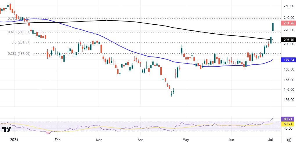 We are now in overbought territory on several momentum indicators with the daily RSI above 80. The near-term retracement levels sit at $216.87 for support and $238.10 as initial resistance. We note Tesla ranks as the fourth most shorted stock in the US with an increase in this positioning since the start of June. One of those shorts is apparently held by Bill Gates, though he has never officially confirmed this.
