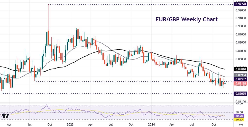 But the eurozone is suffering with domestic political, war and economic stagnation headwinds. Market believe the ECB is toying with a 50bps rate cut. The economic picture between the UK and Europe has therefore diverged to the benefit of sterling. But prices need to decisively break 0.8259 to then challenge another long-term low at 0.8202.